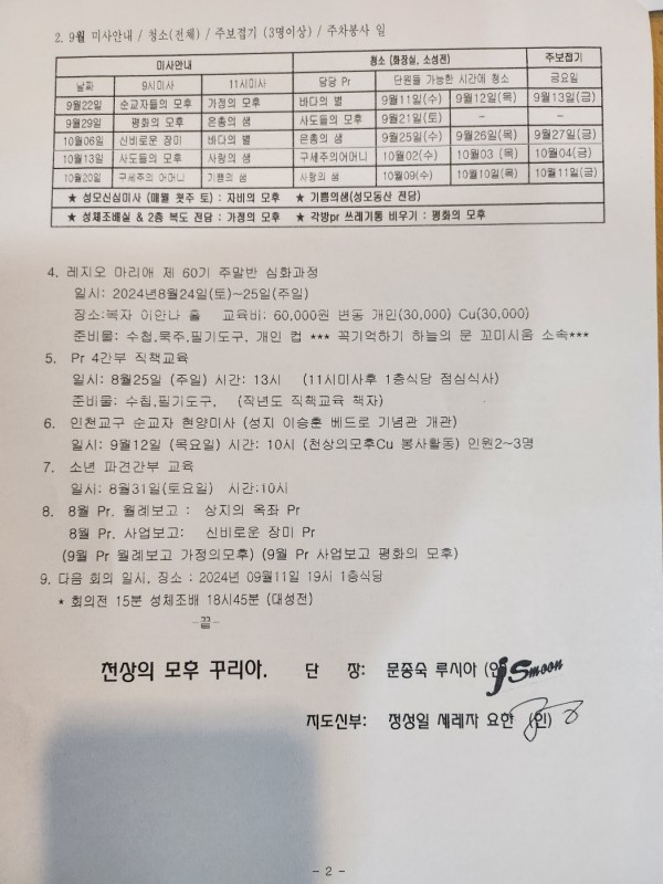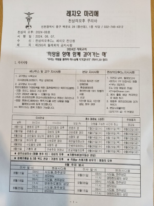 천상의 모후cu. 제295차 월례회의 페이지 정보 작성자 박범환 (211.♡.226.49) 댓글 0건 조회 4,020회 작성일 24-08-07 21:42 목록 본문 2024년 8월 7일 19:00시 부터, 1층 식당에서 천상의 모후cu. 제295차 월례회의가 진행되었다. 이번 월례회의에는 상급단체인 하늘의문 꼬미시움 4간부가 참관하였다.차클레멘스 수녀님의 훈화와 함께 제295차 월례회의가 마무리 되었다. 이전글2024 소년레지오 야외행사 24.08.24 다음글초등부 어린이 첫 영성체를 축하합니다. 24.07.21 댓글 0 댓글목록 등록된 댓글이 없습니다.