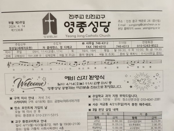 예비신자 환영식 페이지 정보 작성자 박범환 (221.♡.17.163) 댓글 0건 조회 4,620회 작성일 24-04-14 18:49 목록 본문 금일(4월14일) 11시 교중미사시간에 예비신자 13명에 대한 환영식이 있었다. 신부님 환영사와 신자들의 환영찬송가 합창이 이어졌다. 미사후 2층 교리실에서 간단한 오리엔테이션이 진행되었다.이번회차 교리수업은 매 주일 09:30분 부터 약 한시간씩 11월 중순까지 이어지며, 수료후 세례를 받을것으로 예상된다. 이전글레지오마리애 전체단원 교육 24.04.21 다음글천상의 모후cu. 제291차 월례회의 24.04.10 댓글 0 댓글목록 등록된 댓글이 없습니다.
