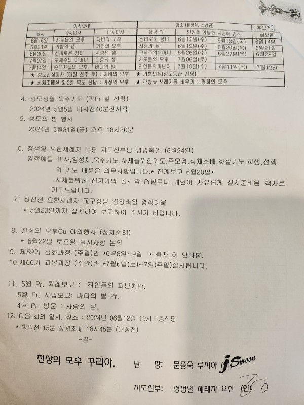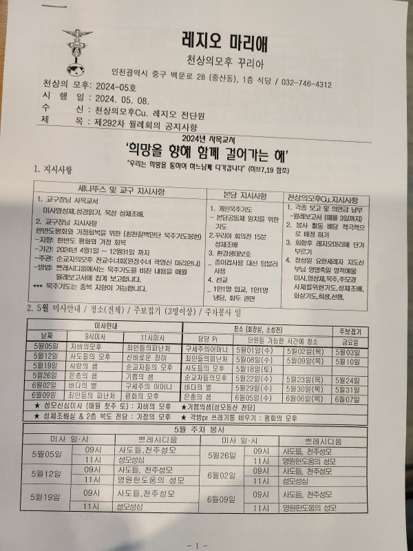 천상의 모후cu. 제292차 월례회의 페이지 정보 작성자 박범환 (221.♡.17.163) 댓글 0건 조회 4,391회 작성일 24-05-08 22:06 목록 본문 2024년 5월 8일 19:00시 부터, 1층 식당에서 천상의 모후cu. 제292차 월례회의가 진행되었다. 금일은 어버이날인 관계로 일부 불참인원이 있었으나 쁘레시디움 2팀의 성과보고 발표가 있었다. 꾸리아 재정형편을 고려하여 단순행사는 각 쁘레시디움별로 진행하며 회의시 간식도 없애는 등 회의에 참석한 4간부들의 결정이 있었다. 차클레멘스 수녀님의 훈화와 함께 제292차 월례회의가 마무리 되었다. 이전글5월 성모의 밤 행사 24.06.01 다음글14처 십자가의 길 축성(祝聖) 24.05.08 댓글 0 댓글목록 등록된 댓글이 없습니다.