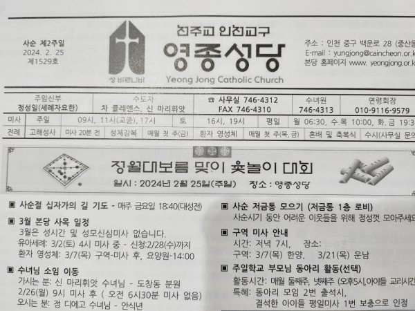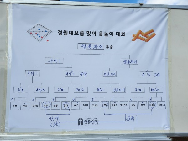 정월대보름 본당 한마음 윷놀이(척사:擲柶)대회 페이지 정보 작성자 박범환 (211.♡.195.209) 댓글 0건 조회 5,516회 작성일 24-02-25 21:42 목록 본문 2024년.2월25일 11시 교중미사후 영종본당 신자 한마음 척사대회가 있었다. 1층 식당에서 전신자 대상으로 무료 국수를 제공하면서 미리 준비한 행사를 진행하기 시작하였다. 초등부 중고등부 성인부 등, 구역별로도 서로 기량을 겨루며 제기차기, 팔씨름, 윷(척사)놀이로 뜻깊은 신자들의 하루가 되었다. 음식을 제공하고 대회운영을 위한 봉사와 화합을 위한 영종본당 모든신자들의 하루로 정월 대보름날을 채워갔다.푸짐한 경품행사와 더불어 청량한 하늘이 선사하는 신선함이 행사를 더욱 빛나게 했다. 이전글마리휘앗 수녀님 임지(任地) 이동 24.02.26 다음글연령회 총회 및 떡국나눔 24.02.18 댓글 0 댓글목록 등록된 댓글이 없습니다.