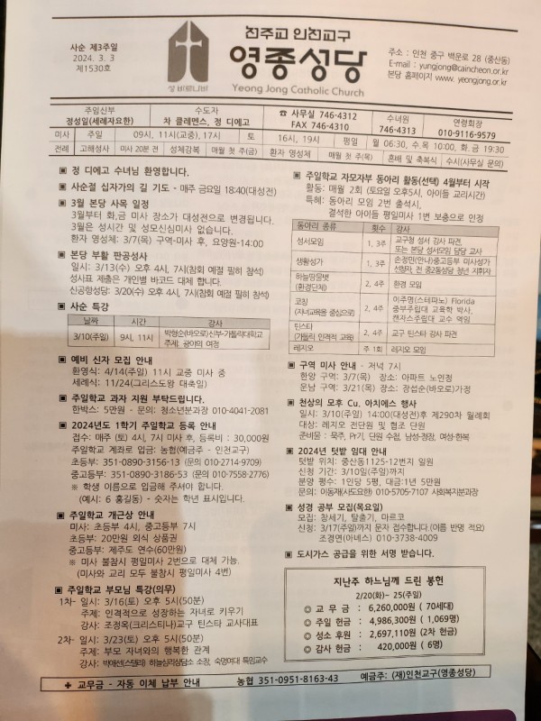 3월 첫 주일미사와 신부님 헌정찬송(offering song) 페이지 정보 작성자 박범환 (221.♡.17.163) 댓글 0건 조회 4,710회 작성일 24-03-03 18:48 목록 본문 사순시기 3월의 첫 주일미사(2024년 3월3일)시간에 주임신부님은 신자2명과 함께 참석한 신자들을 위한 특송(tribute song)을 선사 하였다. 특송트리오(?)는 미사에 참석한 신자들의 열렬한 박수와 함께 귀중한 시간을 함께하였다.또한 마리휘앗 수녀님의 후임으로 부임한 정 디에고 수녀님은 사목회의 환영꽃다발과 함께 환영식이 있었다. 이전글신학대학교 입학식 - 본당 김성호 사도요한, 인천 가톨릭대학교 신학대학입학 24.03.04 다음글정 디에고 수녀님 첫 미사 봉헌 24.02.27 댓글 0 댓글목록 등록된 댓글이 없습니다.
