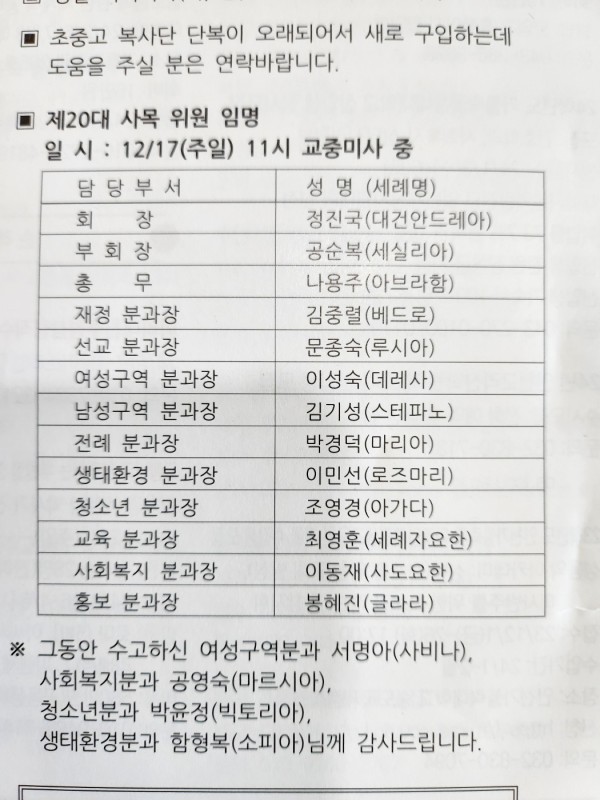 제20대 사목회 구성 및 임명장 수여 페이지 정보 작성자 박범환 (221.♡.17.163) 댓글 0건 조회 5,326회 작성일 23-12-17 17:53 목록 본문 금일(12/17) 교중미사중에 제20대 사목회 임원 임명장 수여식이 있었다. 특히 본당 주임신부님의 초청으로 교구청 사무처장 김일회 빈첸시오 신부님의 참석아래 신도들의 박수와 함께 거행되었다. 이전글2023성탄대축일 저녁(밤)미사 23.12.25 다음글천상의 모후cu. 제287차 월례회의 23.12.13 댓글 0 댓글목록 등록된 댓글이 없습니다.