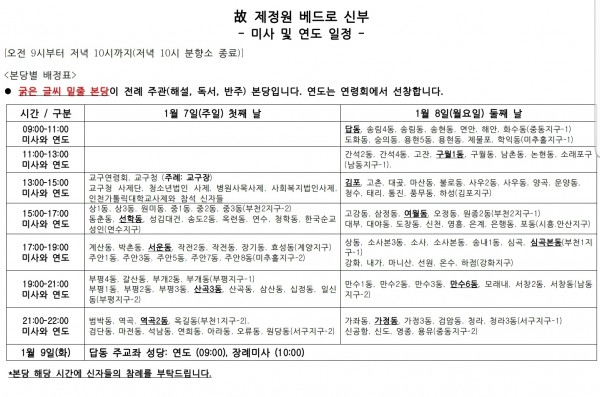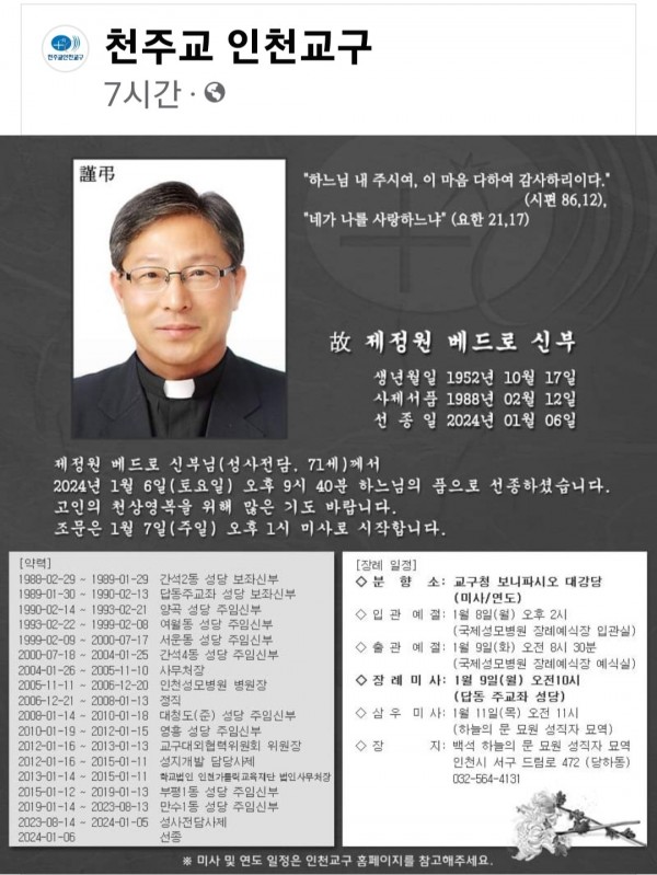 인천교구 제정원 베드로 신부 선종미사 페이지 정보 작성자 박범환 (221.♡.17.163) 댓글 0건 조회 5,221회 작성일 24-01-08 23:32 목록 본문 2024년1월6일 제정원 베드로 신부님께서 하느님품으로 선종하셨습니다. 조문은 1월7일(주일) 오후1시 미사로 시작하였다.영종본당에서는 금일(1월8일 21:00) 레지오단원 및 사목위원과 여러신도들이 교구청 보나파시오 대강당에 참석하여 중동지구 장례미사를 보았다.미사집전은 본당 주임신부님(정성일 세례자요한)을 비롯하여 함께한 신부님들과 엄숙하게 봉헌 하였다. 이전글천상의 모후cu. 제288차 월례회의 24.01.10 다음글2024 첫 아동,청소년(미성년) 레지오 선서식 24.01.06 댓글 0 댓글목록 등록된 댓글이 없습니다.