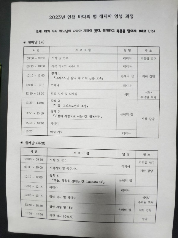 레지오 마리애 제50기 영성과정 교육 페이지 정보 작성자 박범환 (115.♡.175.156) 댓글 0건 조회 4,866회 작성일 23-11-04 20:59 목록 본문 11월 4일 , 금일 09:30 분부터 레지오마리애 제50기 영성과정교육이 부천소재 '성분도 은혜의집'에서 시작되었다 인천 바다의별 레지아 주최로 개설하여 심화과정 이수자를 대상으로 한 이번교육은 내일(11/05)까지 이틀간 진행된다. 이전글교우 자녀 관면혼배(혼인서약) 23.11.07 다음글예비교리자 환영찬송 23.10.29 댓글 0 댓글목록 등록된 댓글이 없습니다.