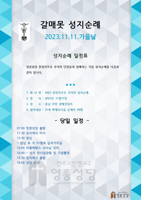 11월 11일 본당 천상의모후 꾸리아 단원 85명은 충남 보령에 위치한 갈매못성지를 다녀왔다 . 아침 07:00에 출발하여 당일 일정으로 20:00에 성당 주차장으로 귀환하는 일정을 가졌다.