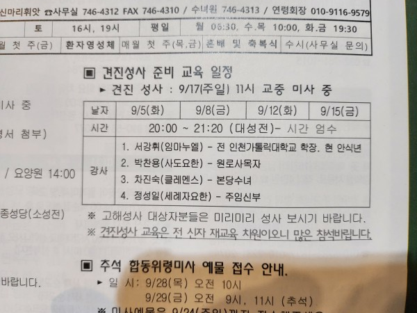 지난 9월5일(화)  첫 교육에는 견진성사 대상자 외 많은 신도들 약 180여명이 참여하였으며, 금일 교육에도 많은 신자가 교육강연에 참여하였다.