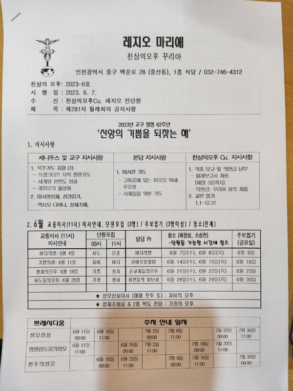 천상의 모후cu. 제281차 월례회의 및 꾸리아단장 선출 페이지 정보 작성자 박범환 (221.♡.17.163) 댓글 0건 조회 5,022회 작성일 23-06-07 21:43 목록 본문 6월7일 19:00시 부터, 1층 식당에서 천상의 모후cu. 제281차 월례회의가 진행되었다. 마리휘앗 수녀님의 훈화말씀과 지난 한달동안의 쁘레시디움 의 활동보고가 있었다.이날 회의에서 새 꾸리아 단장선출이 있었으며, 만장일치로 문종숙 루시아 자매가 선출되멌다. 이전글전지작업 및 화단정리 23.06.08 다음글관내 연수본당 미사및 어린이 첫영성체 의식 23.05.30 댓글 0 댓글목록 등록된 댓글이 없습니다.
