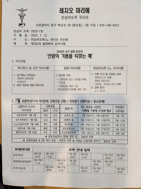 천상의 모후cu. 제282차 월례회의 페이지 정보 작성자 박범환 (221.♡.17.163) 댓글 0건 조회 4,713회 작성일 23-07-12 22:30 목록 본문 7월 12일 19:00시 부터, 1층 식당에서 천상의 모후cu. 제282차 월례회의가 진행되었다. 새로 부임하신 정성일 세례자요한 주임신부의 훈화말씀과 강복이 있었으며, 지난 한달동안의 쁘레시디움 의 활동보고가 있었다.이날 회의는 새로 선출된 꾸리아 단장(문종숙 루시아)의 첫 회의주관으로 4간부 및 차클레멘스 수녀님 참관으로 진행과 마무리 되었다. 이전글교구청 행사(2기 해설사 수료식)소식 23.07.15 다음글세례자요한 정성일 주임신부 첫 미사 23.07.11 댓글 0 댓글목록 등록된 댓글이 없습니다.