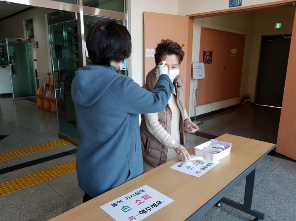 1) 성당 입구에서 체온을 측정하고 손세정제를 사용합니다.